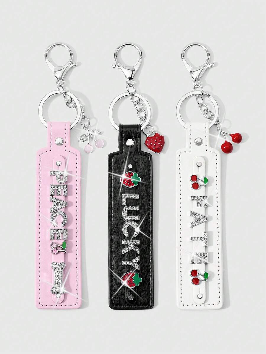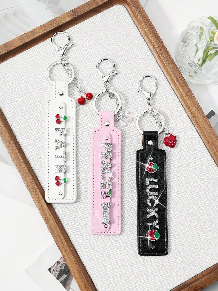 1 New Y2k Classic Simple Temperament Fashionable Retro High Sense Black/White/Pink Leather Silver Shiny Rhinestone Letters "Peace" "Fate" "Lucky" Cherry Strawberry Bone Rivet Drip Oil Love Pendant DIY Keychain Accessories Bag Pendant Pendant, Random Color, Suitable For Girls, Ladies, Couples, Sisters, Girlfriends, Daily Wear, Holiday Gifts