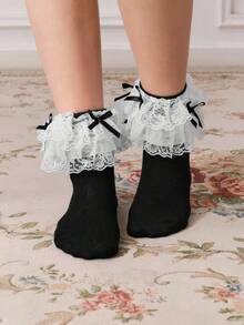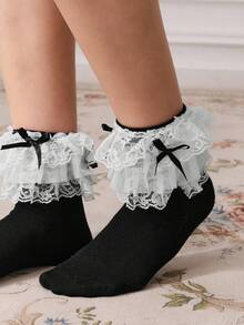 Kawaii 1 Pair Cute 3-Layer Lace Trim Mid-Calf Socks & 1 Pair Solid Color Bow Decor Short Socks, Versatile JK School Style For Women