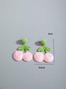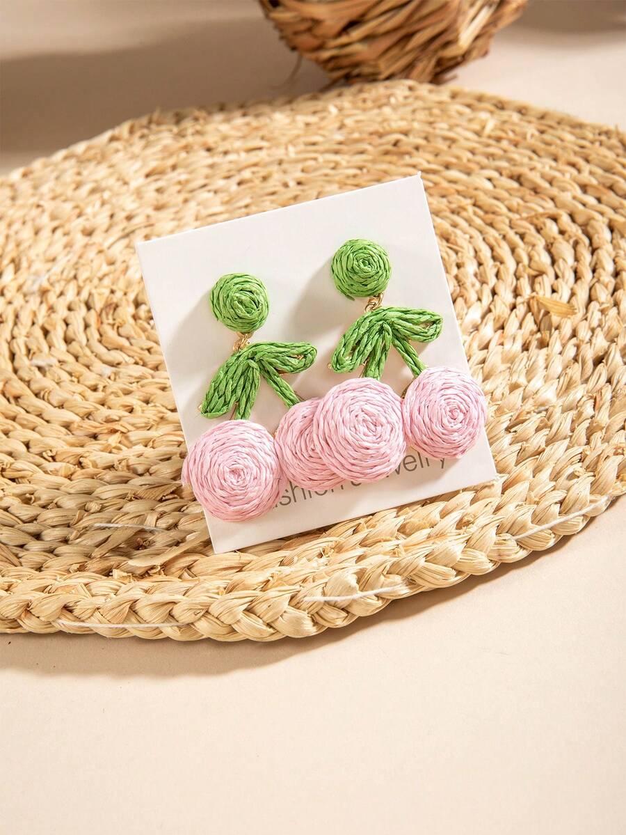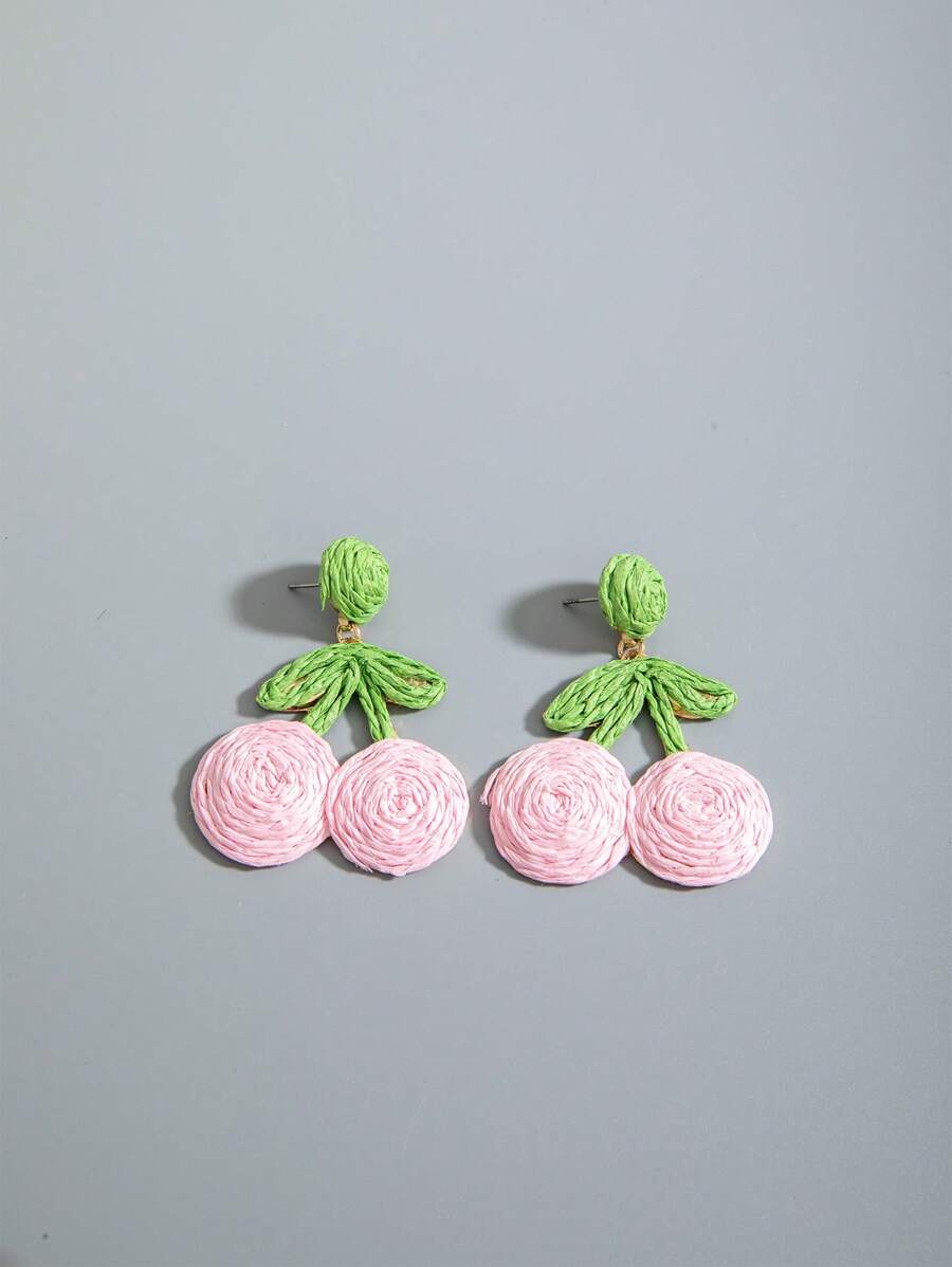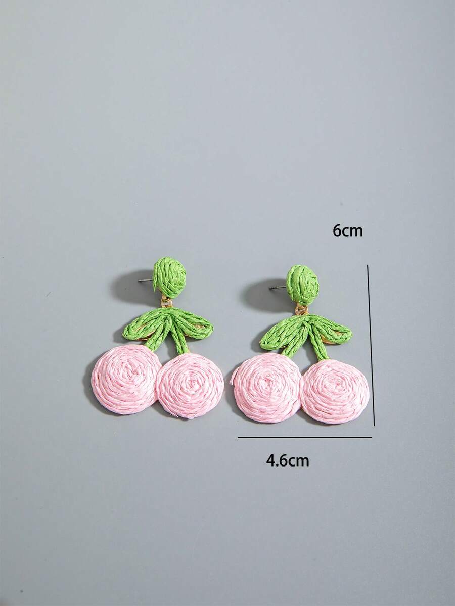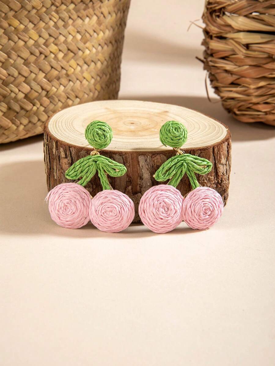 1 Pair Fashionable Cute Pink Raffia Cherry Pendant Earrings For Women, Suitable For Party, Gift