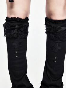 Kawaii 1 Pair Punk Style Black Lace Trim Leg Warmers, Y2K Cross Element Solid Color Flared Leg Warmers, & Slimming, Suitable For Daily, Festival, Party Outfits