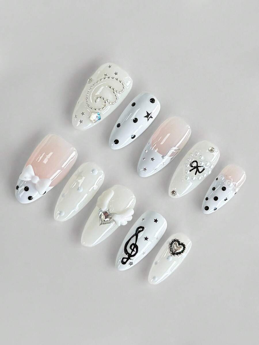 Anime 10pcs Cute Bowknot Music Note Star Element High Quality Handmade False Nails + 3pcs Double-Sided Adhesive, Y2K French Style Rhinestone Chain Polka Dot Removable Nail Art Stickers, Suitable For Holidays, Parties, Dancing And Daily Wear