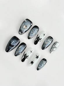 Grunge Punk 10pcs Dark Gothic Bat & Star Pattern High Quality Handmade False Nails + 3pcs Double-Sided Adhesive, Y2K Style Rhinestone Blue & Black Ombre Nail Stickers, Detachable Hand-Painted Black Cat Nail Art Stickers, Suitable For Holidays, Parties, Dancing And Daily Wear