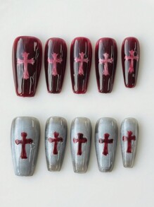 10pcs High Quality Handmade False Nails In Dark Gothic Cross Style + 3pcs Double-Sided Adhesive, Y2K Gothic Punk Nail Art, Detachable Color-Block Hand-Painted Nail Stickers, Suitable For Festival Party Dancing And Daily Wear