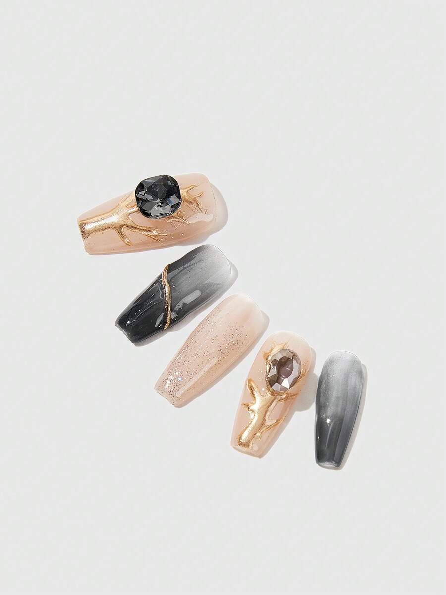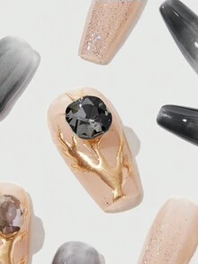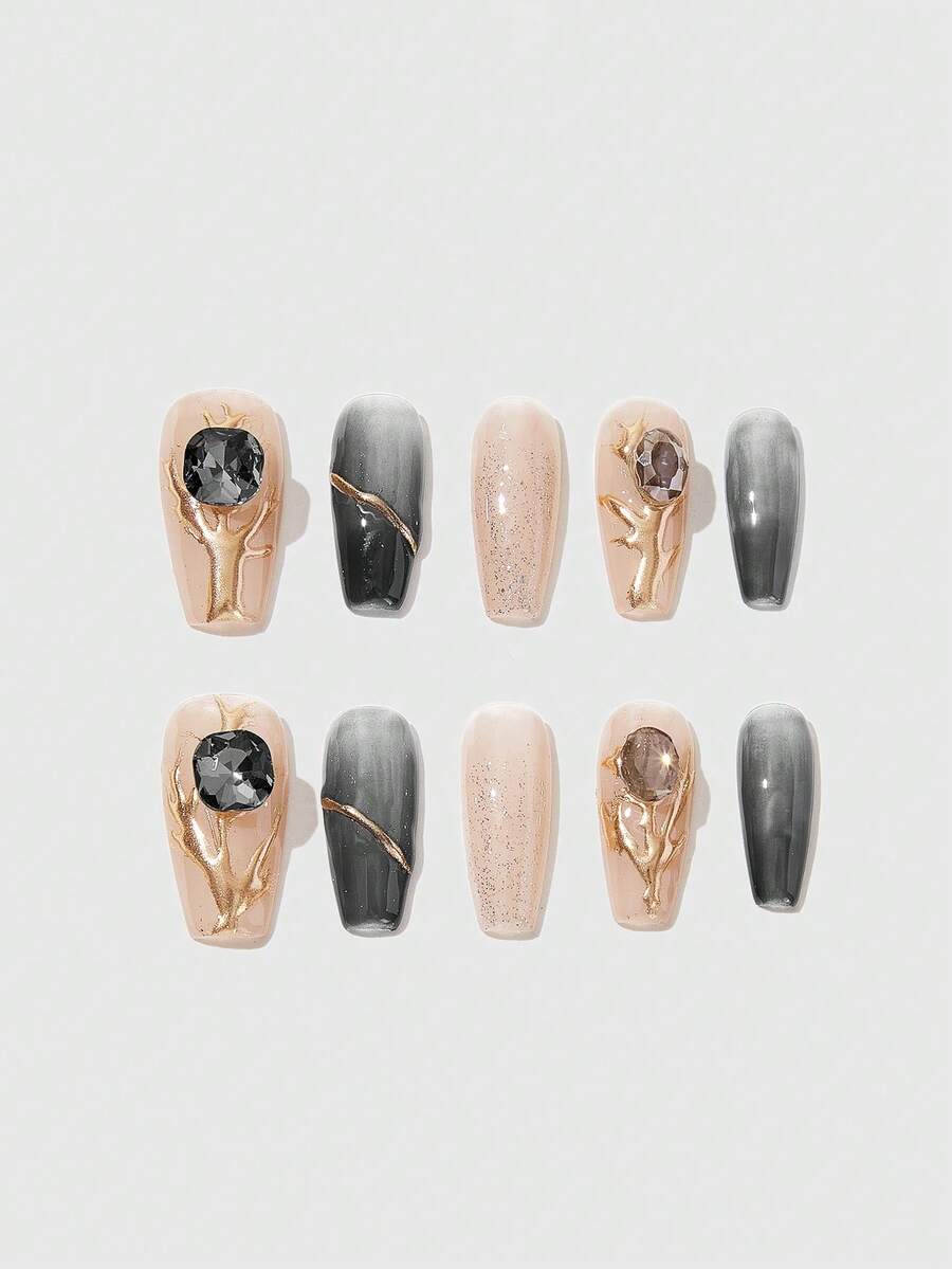 Goth 10pcs Long Coffin 3D Rhinestone Decor Fake Nail & 1pc Nail File & 1sheet Tape