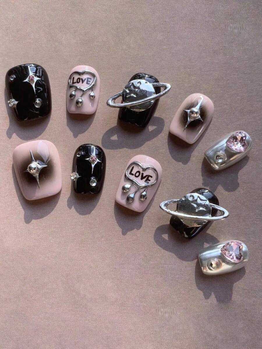 10pcs Short Square Rhinestone Decor Planet Design Fake Nail Kit