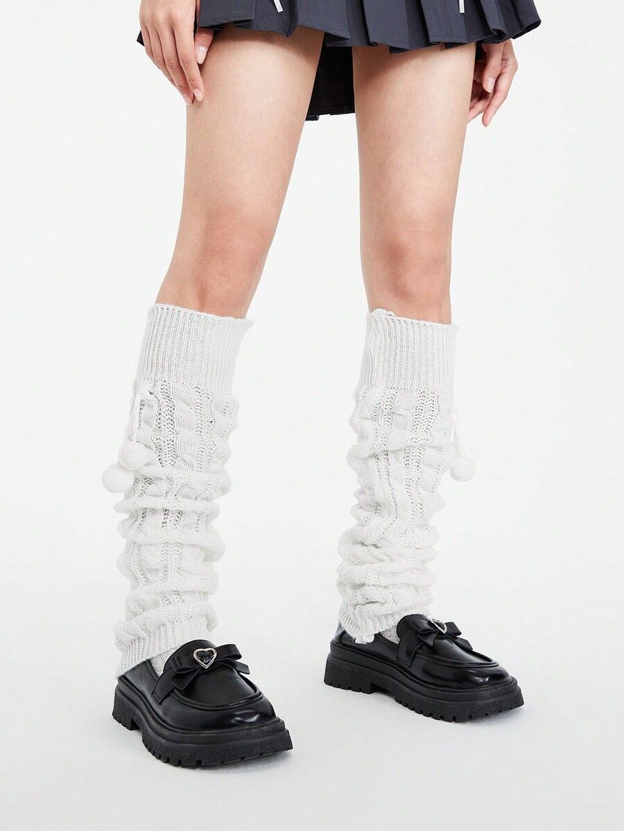 Anime 1pair Cute Long Knitted Leg Warmers With Fluffy Pom Pom For Women