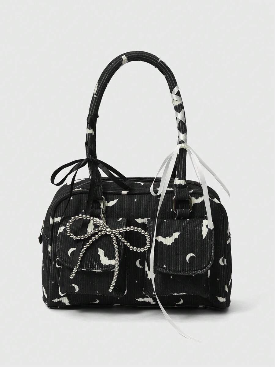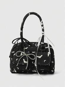 Kawaii 1pc Black Bat Print Fashion Portable Large Capacity Pearl Bow Handbag For Women