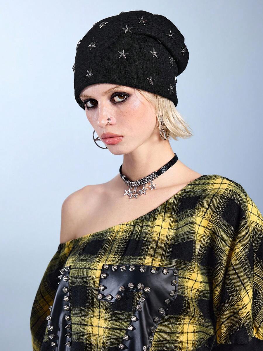 Goth 1pc Black Punk Rock Vintage Metal Stud Star Design Warm Knit Beanie Hat, Fashionable Minimalist Unisex Accessory For Daily, School, Date, Shopping, Travel, Halloween And More