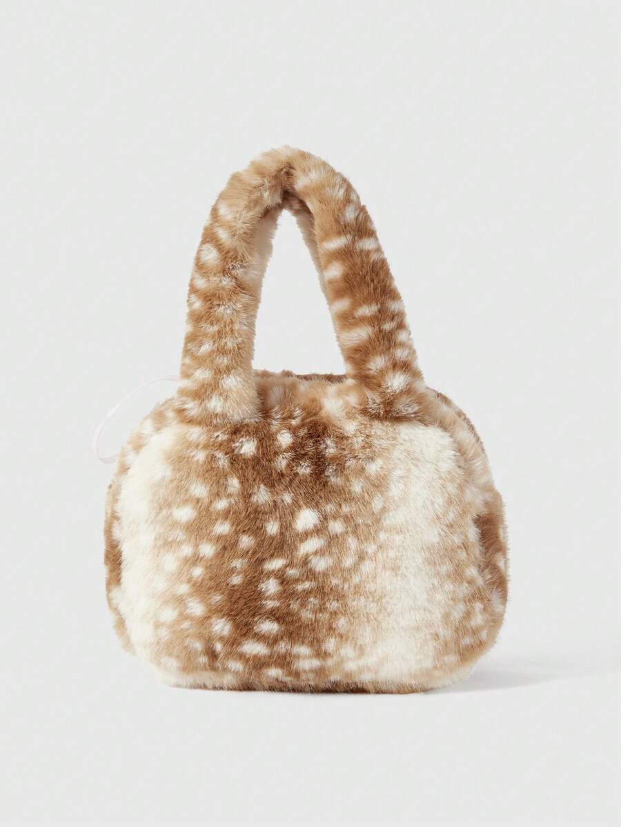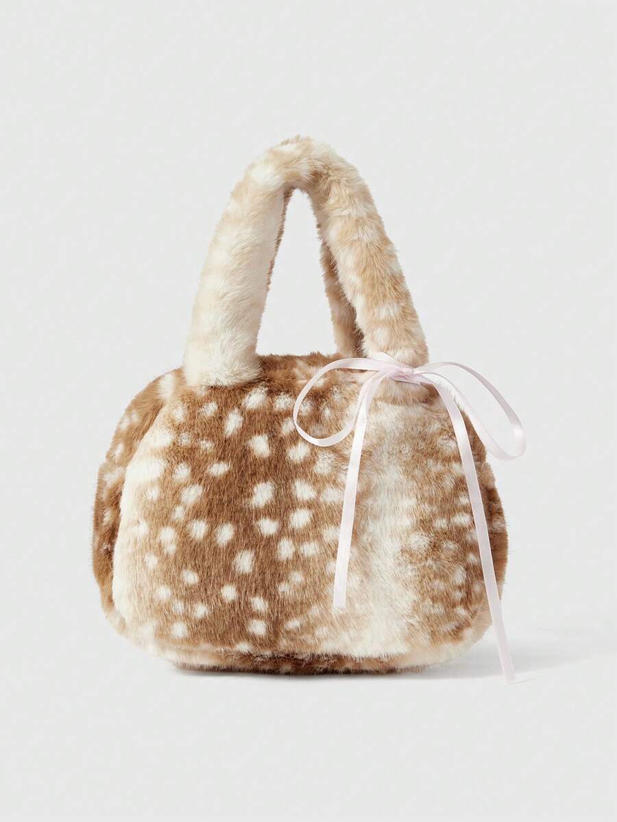 Fairycore 1pc Brown Small Fashionable Portable Plush Lace Bow Cute Ladies Handbag