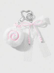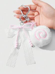 Kawaii 1pc Cute & Simple Handmade Beaded, Lace, Bow, Plush Fish Cake, Heart Shaped Keychain/Bag Charm, Versatile For Women, Suitable As Daily Accessory Or Gift