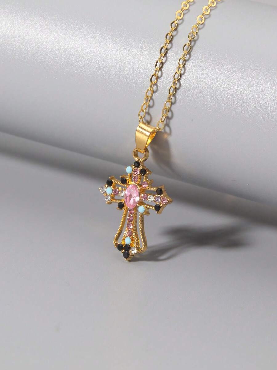 1pc Gothic Luxury Cross Pendant Necklace With Rhinestones, Holiday Party Gift, Halloween