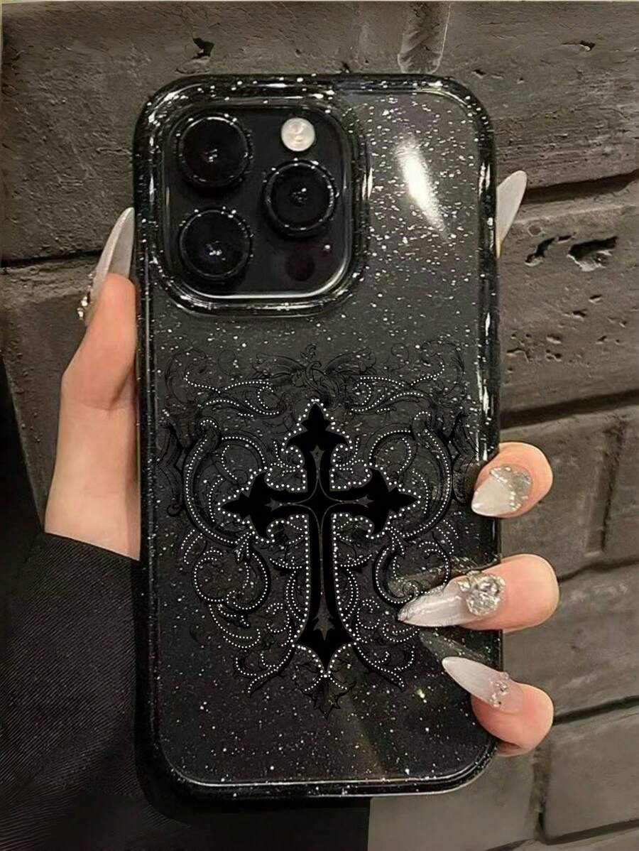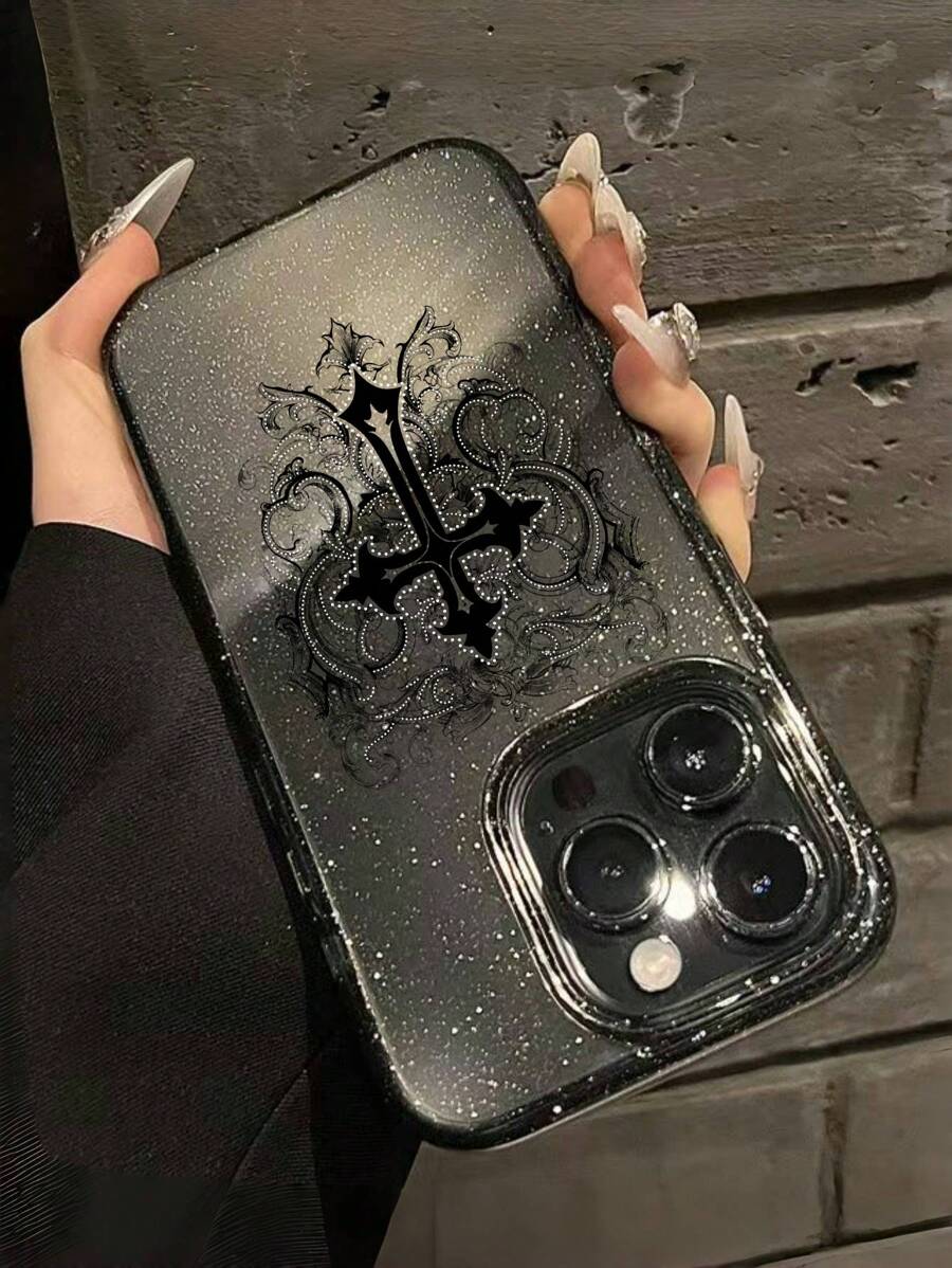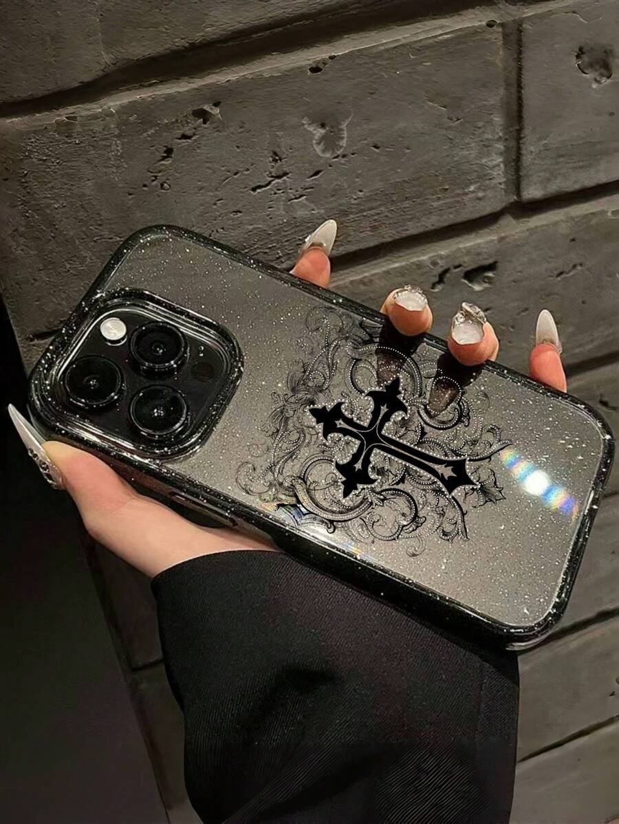 1pc Gothic Style Cross Pattern Transparent Glitter Phone Case, Halloween