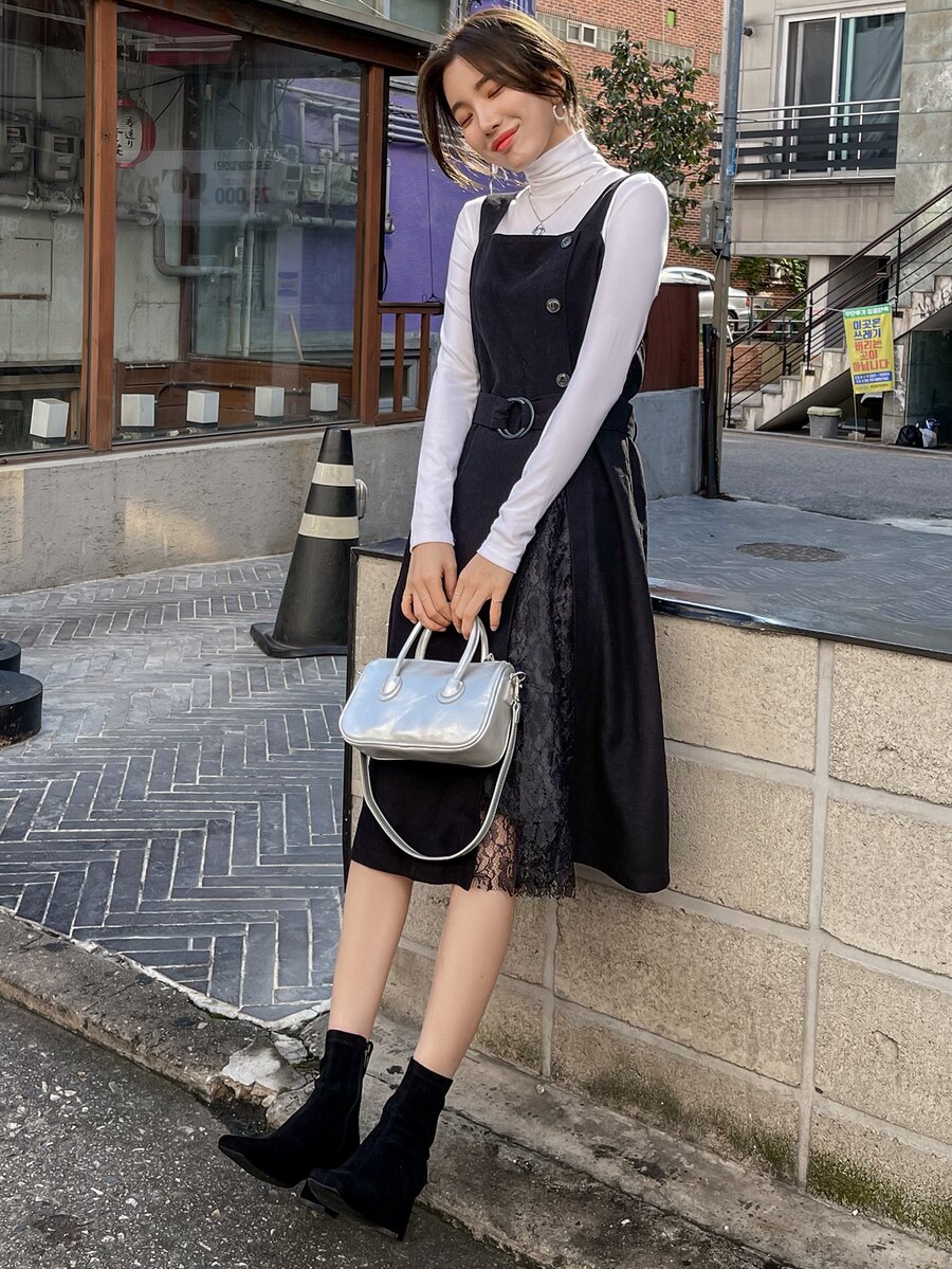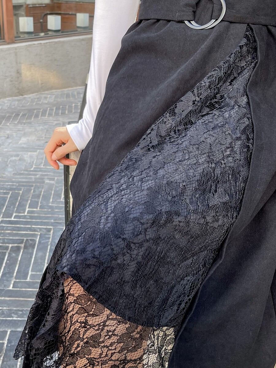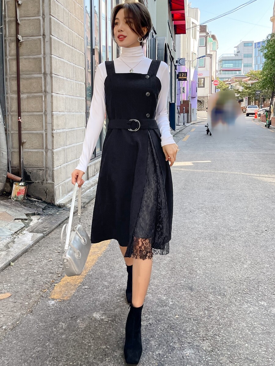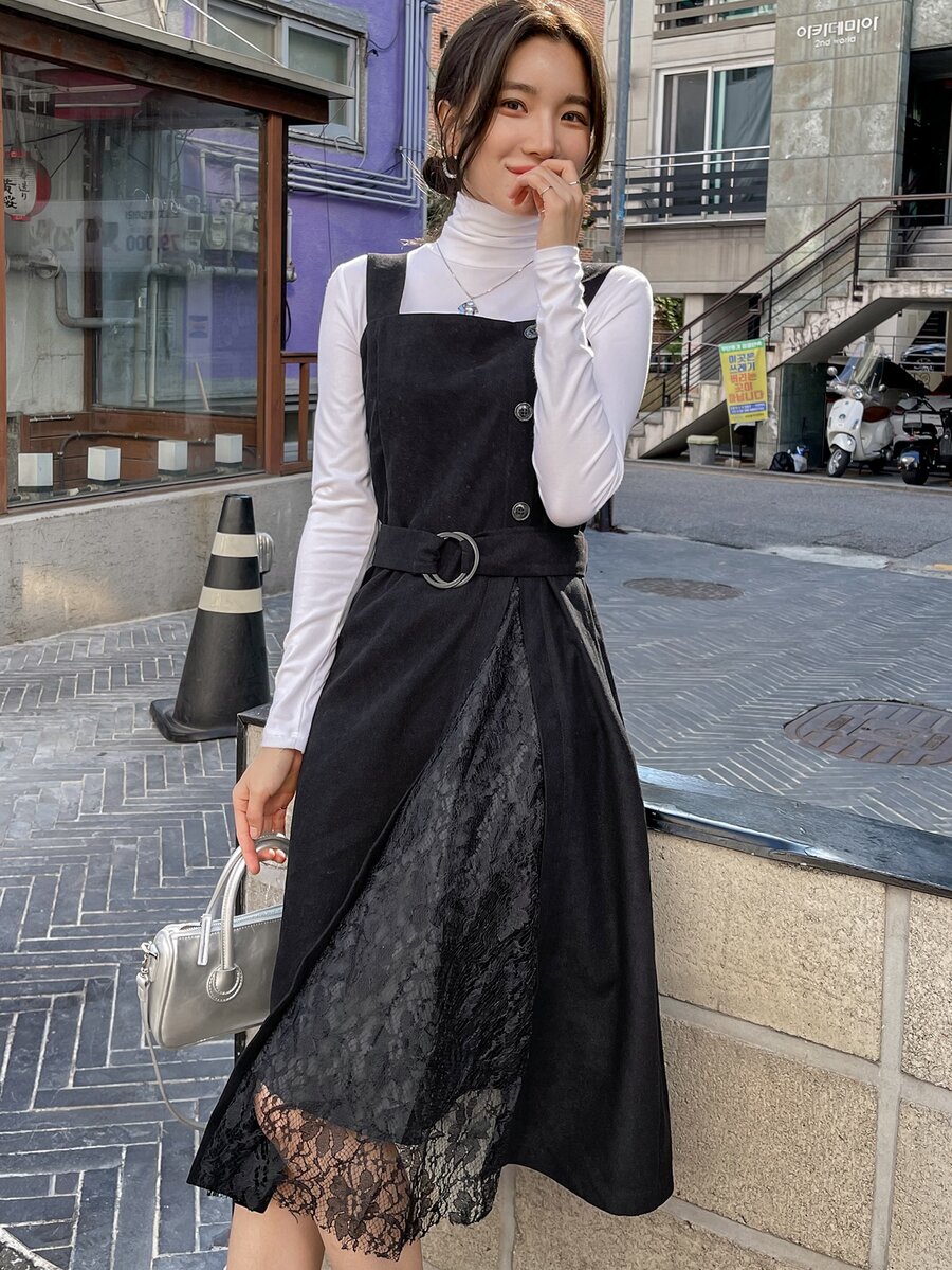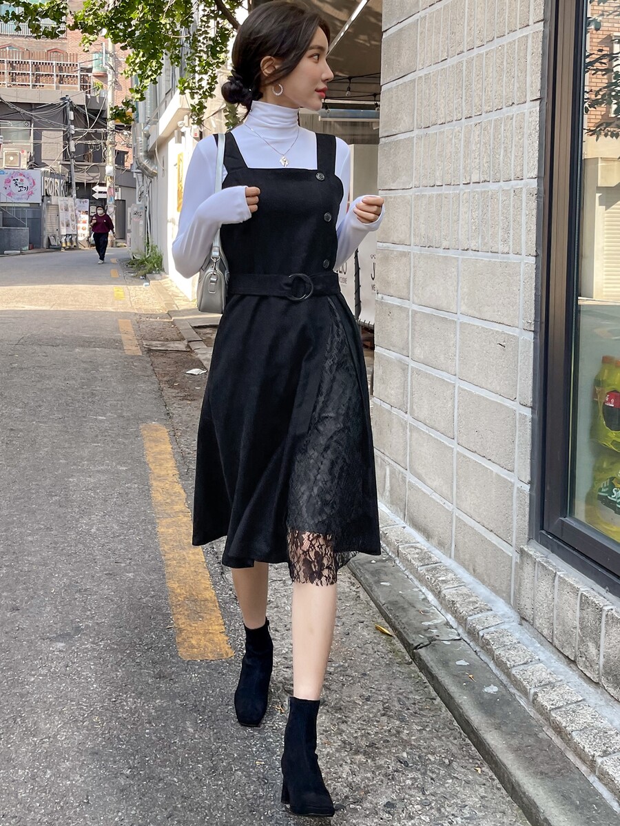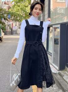 1pc Lace Panel Belted Overall Dress