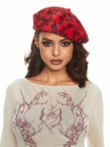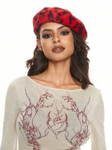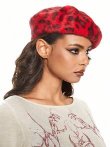 Grunge Punk 1pc Leopard Print Red Beret Hat, Fashionable Fuzzy Hat For Women, Retro Edgy Y2K Stylish Headwear