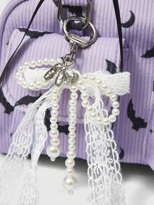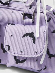 Kawaii 1pc Purple Corduroy Bat Print Fashion Portable Bow Pearl Decor Large Capacity Gothic Style Tote Bag For Women