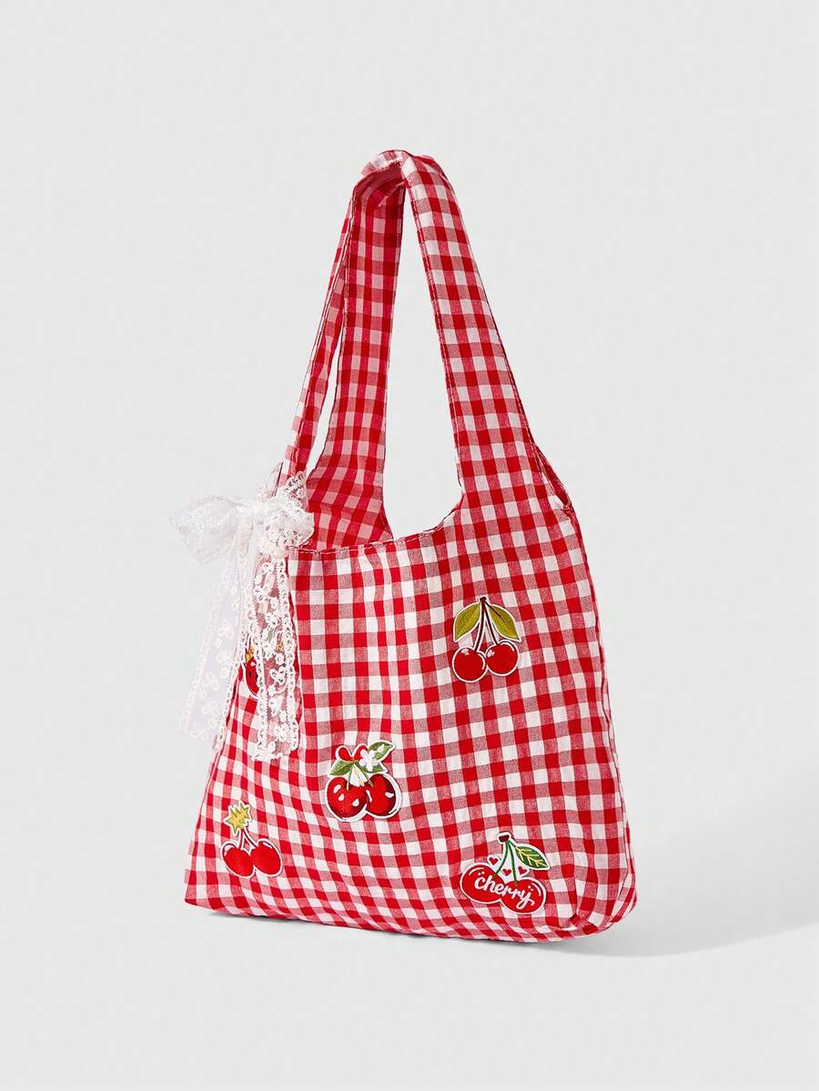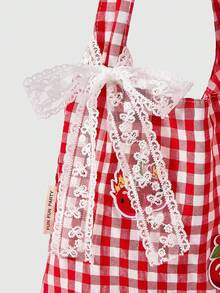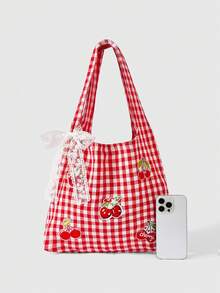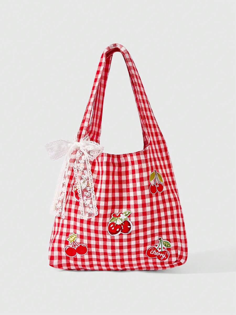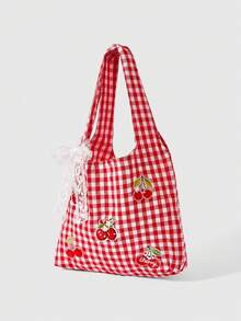 Kawaii 1pc Strawberry Embroidered Vintage Red & White Plaid Backpack, Large Capacity Shoulder Bag, Lightweight Tote Bag, Versatile For Back To School And Vacation