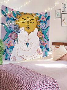 1pc Sun & Cat Pattern Tapestry With Storage Bag