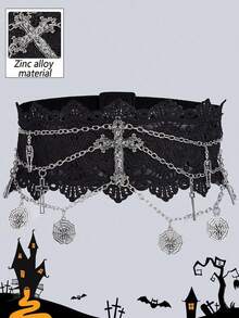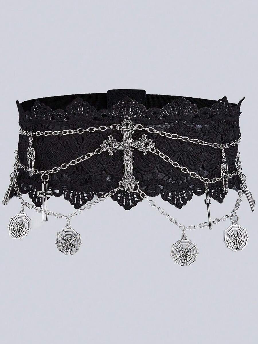 Goth 1pc Women's Black Lace Elastic Fabric 3-Layer Chain Cross Skull Spider Web Decor Gothic Style Cinched Waist Dress Accessory, Versatile For Daily Wear