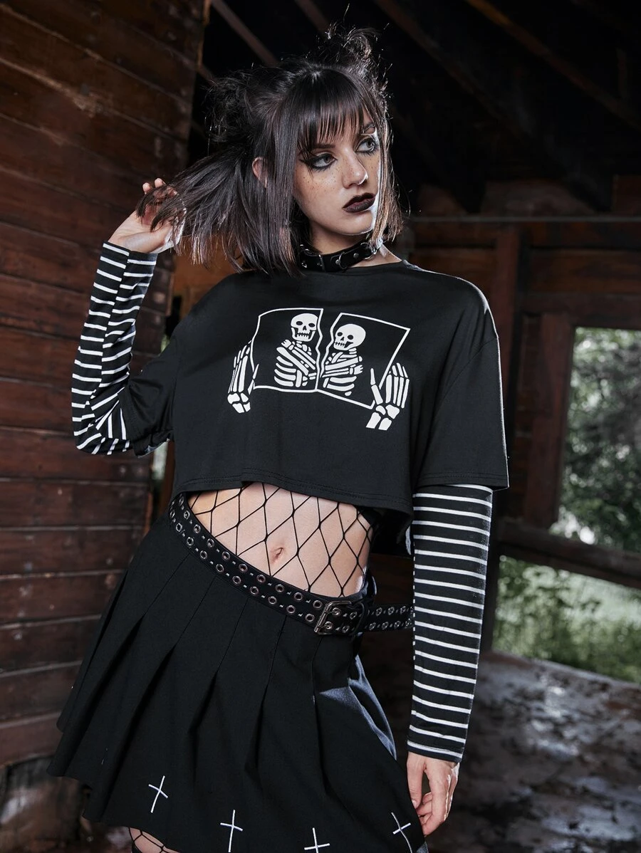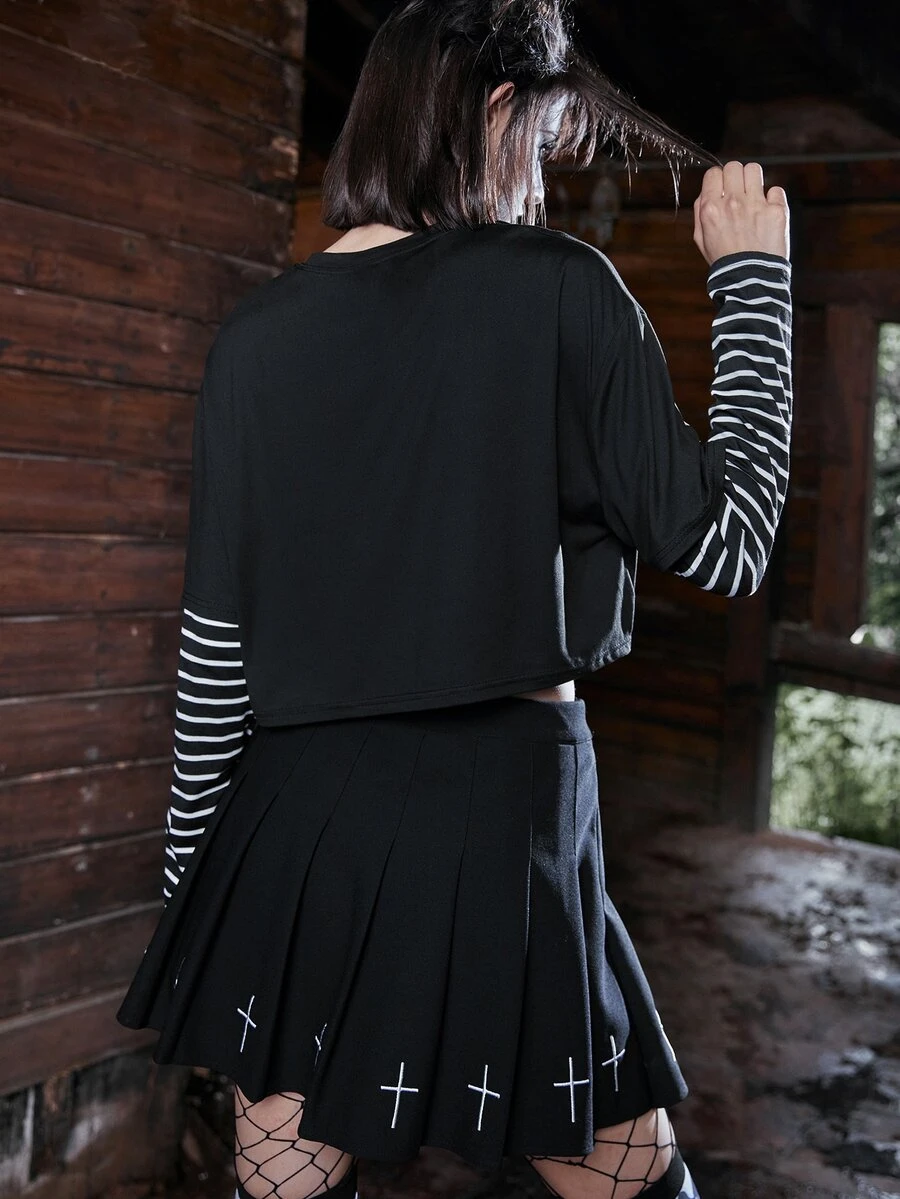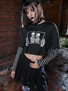 Catsneeze 2 In 1 Striped Sleeve Skull Graphic Tee