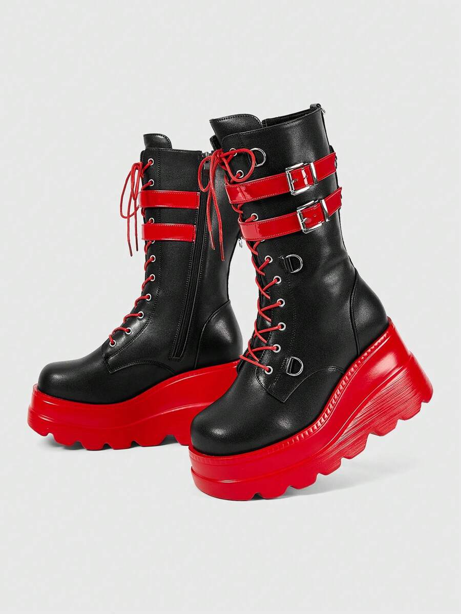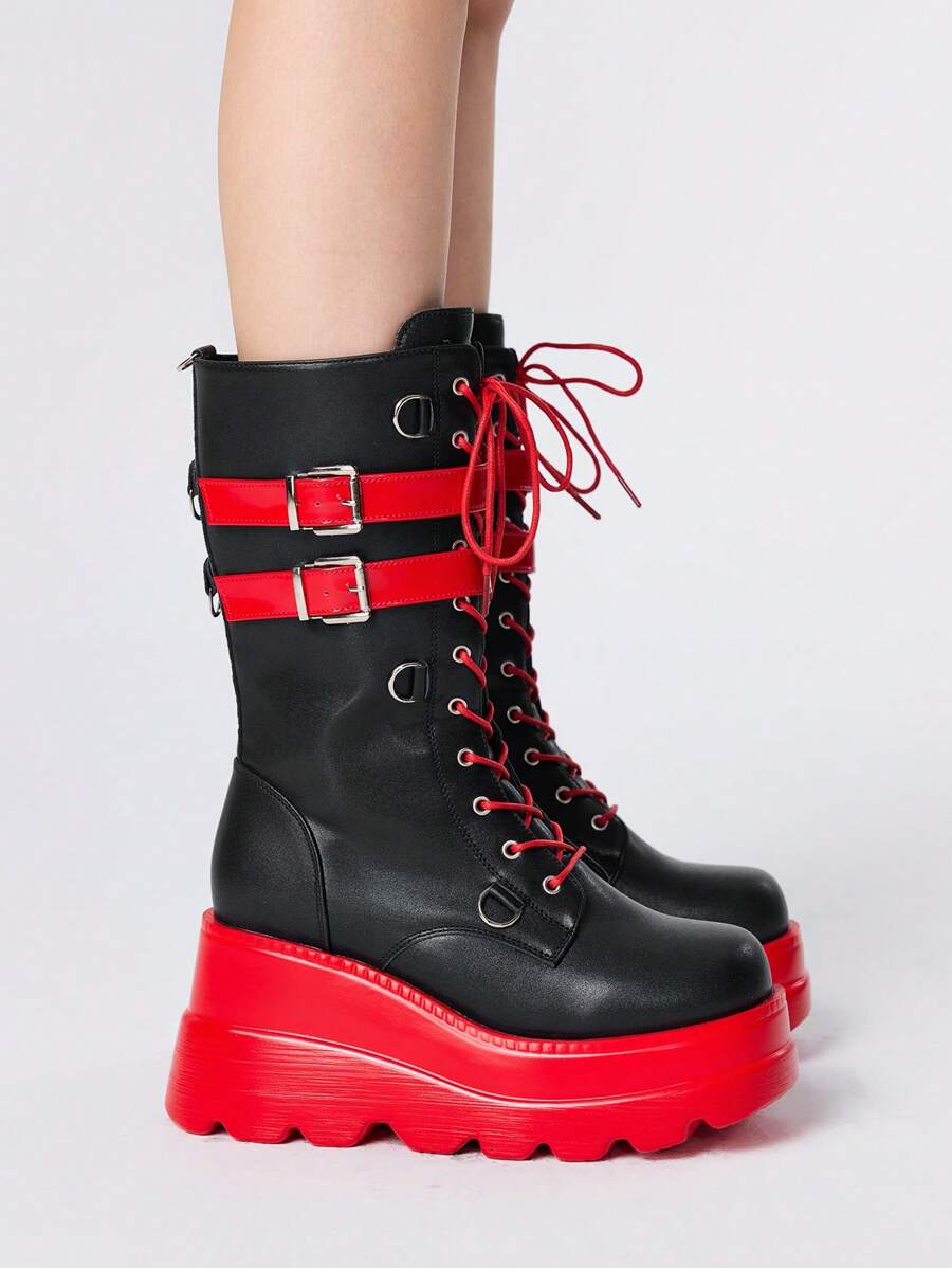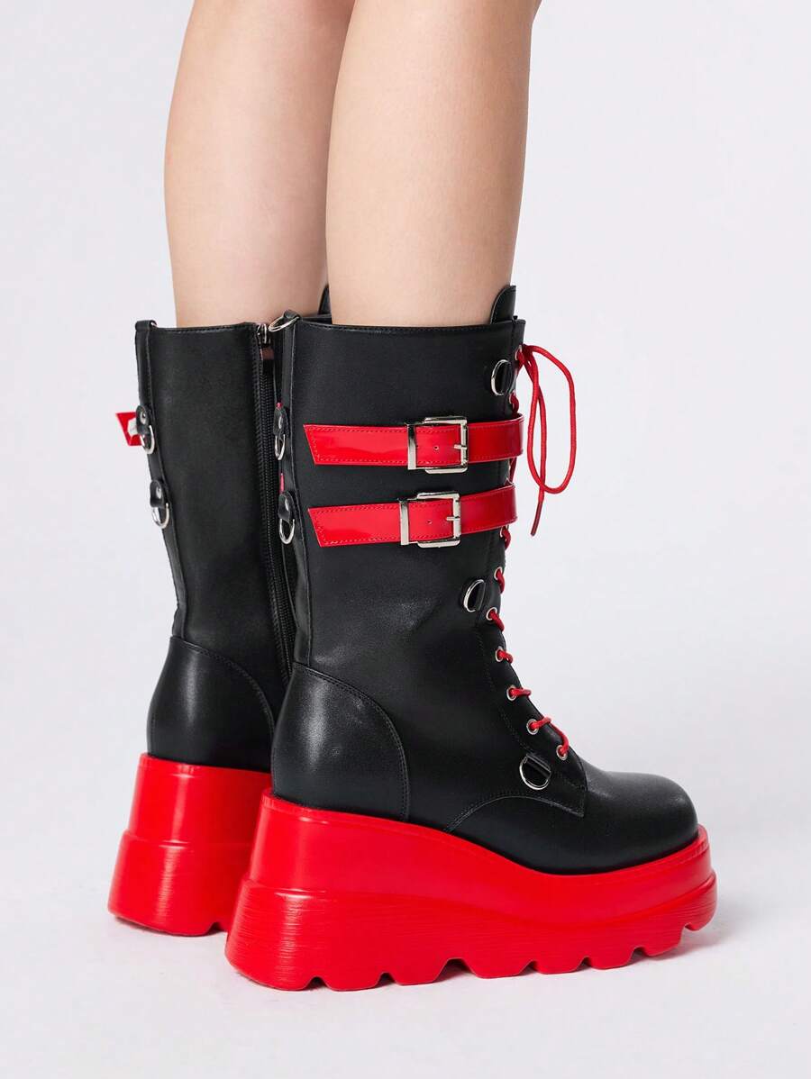 2-Tone Metal Eyelet Multi-Strap Round Toe Chunky Platform Mid-Calf Punk Boots, Red/Black, Daily Punk Rock Street Style