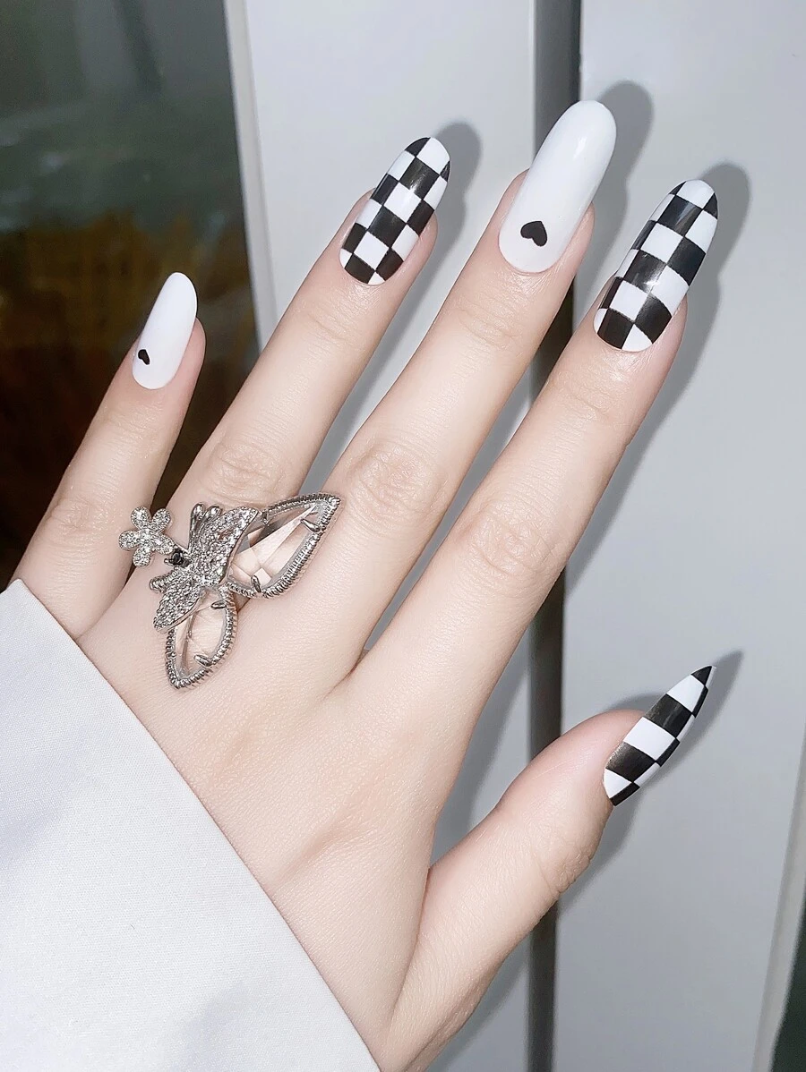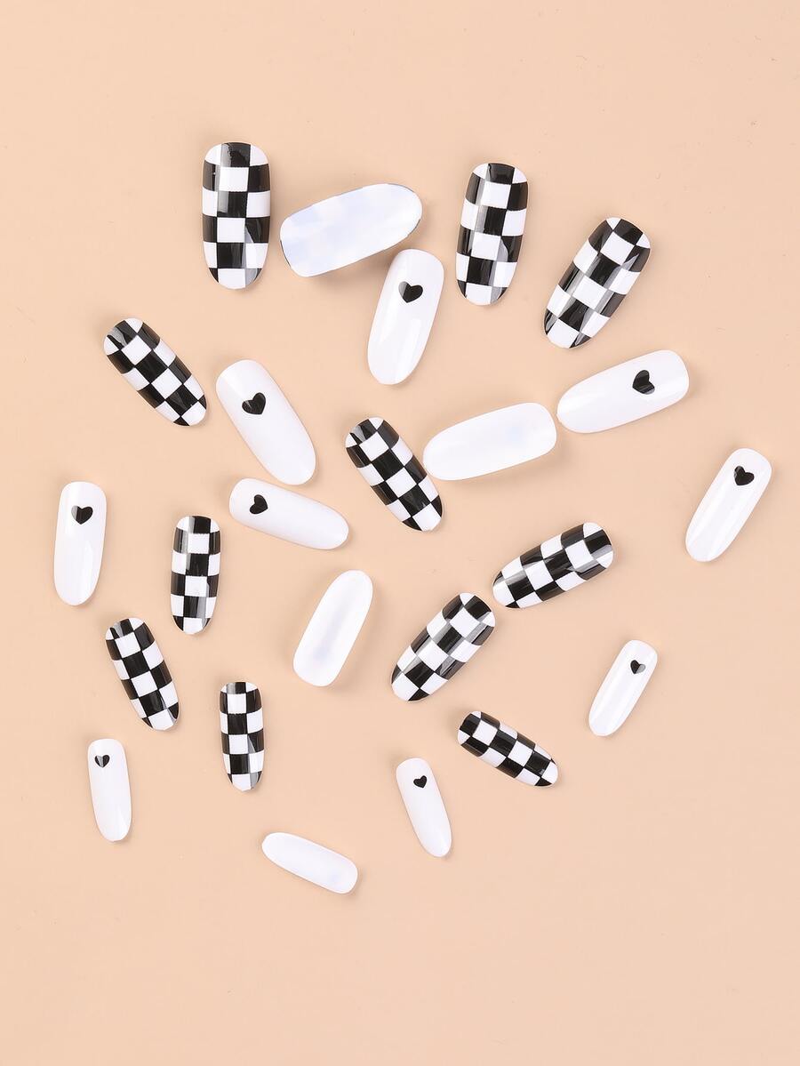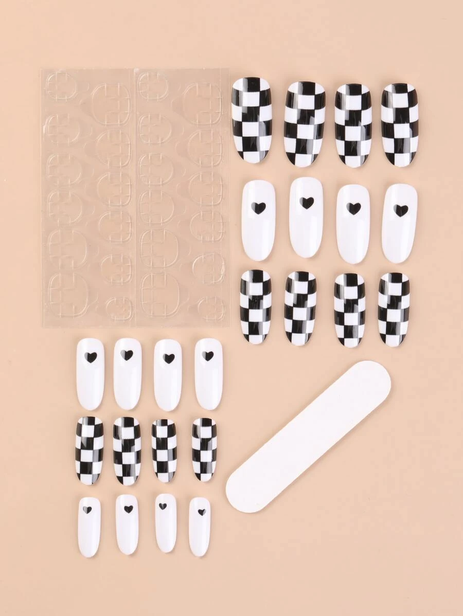 24pcs Checkered Print Fake Nail & 2pcs Nail Art Tool