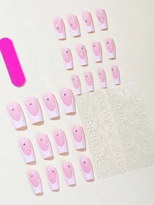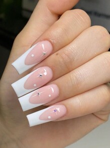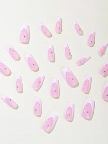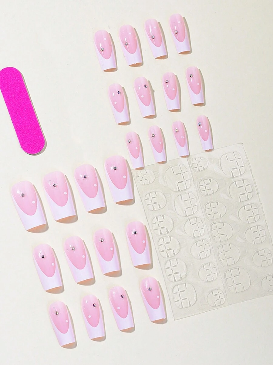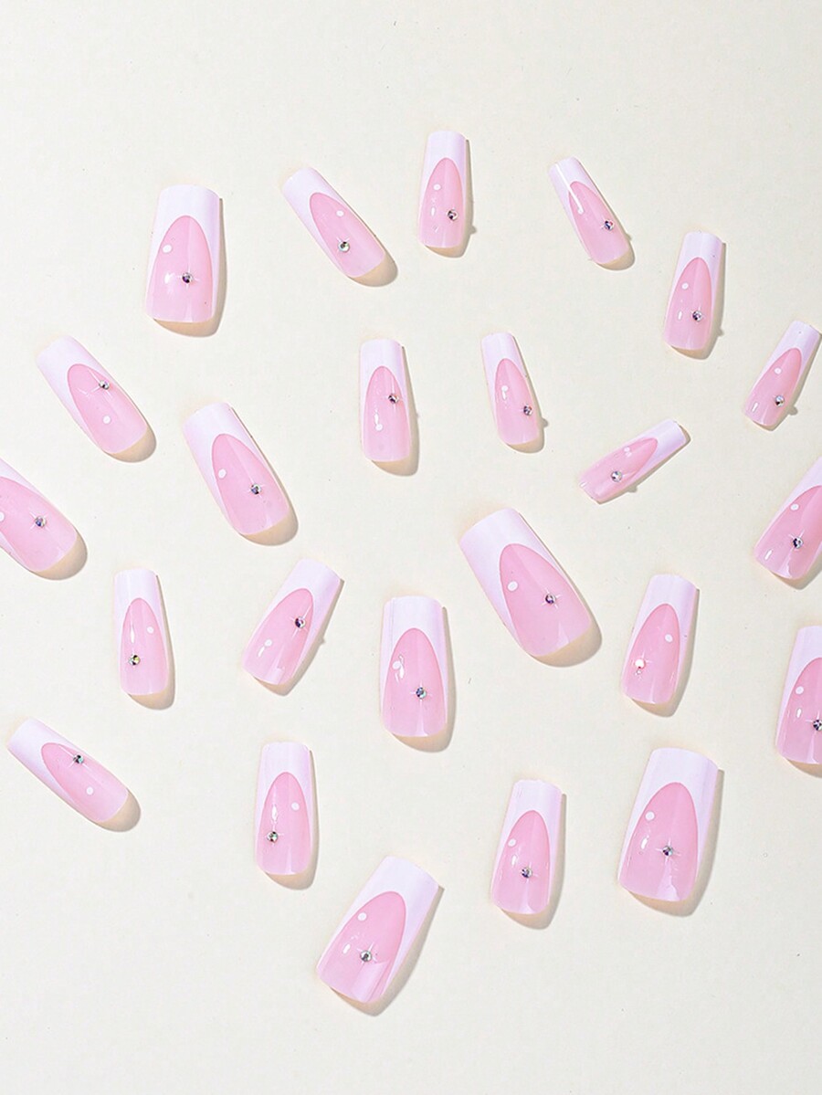 24pcs Long Coffin Colorblock Rhinestone Decor Fake Nail & 1sheet Tape & 1pc Nail File