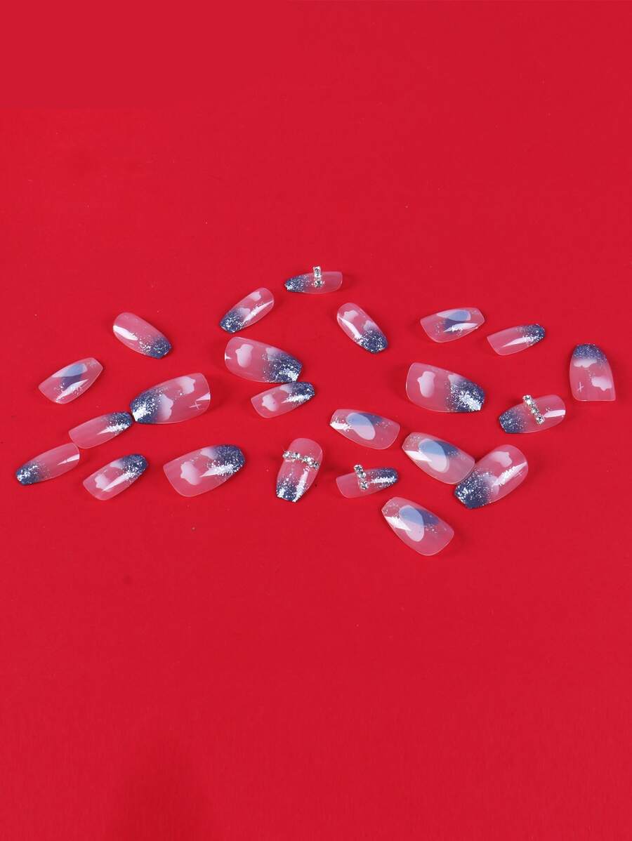 24pcs Long Coffin Rhinestone Decor Fake Nail & 1sheet Tape