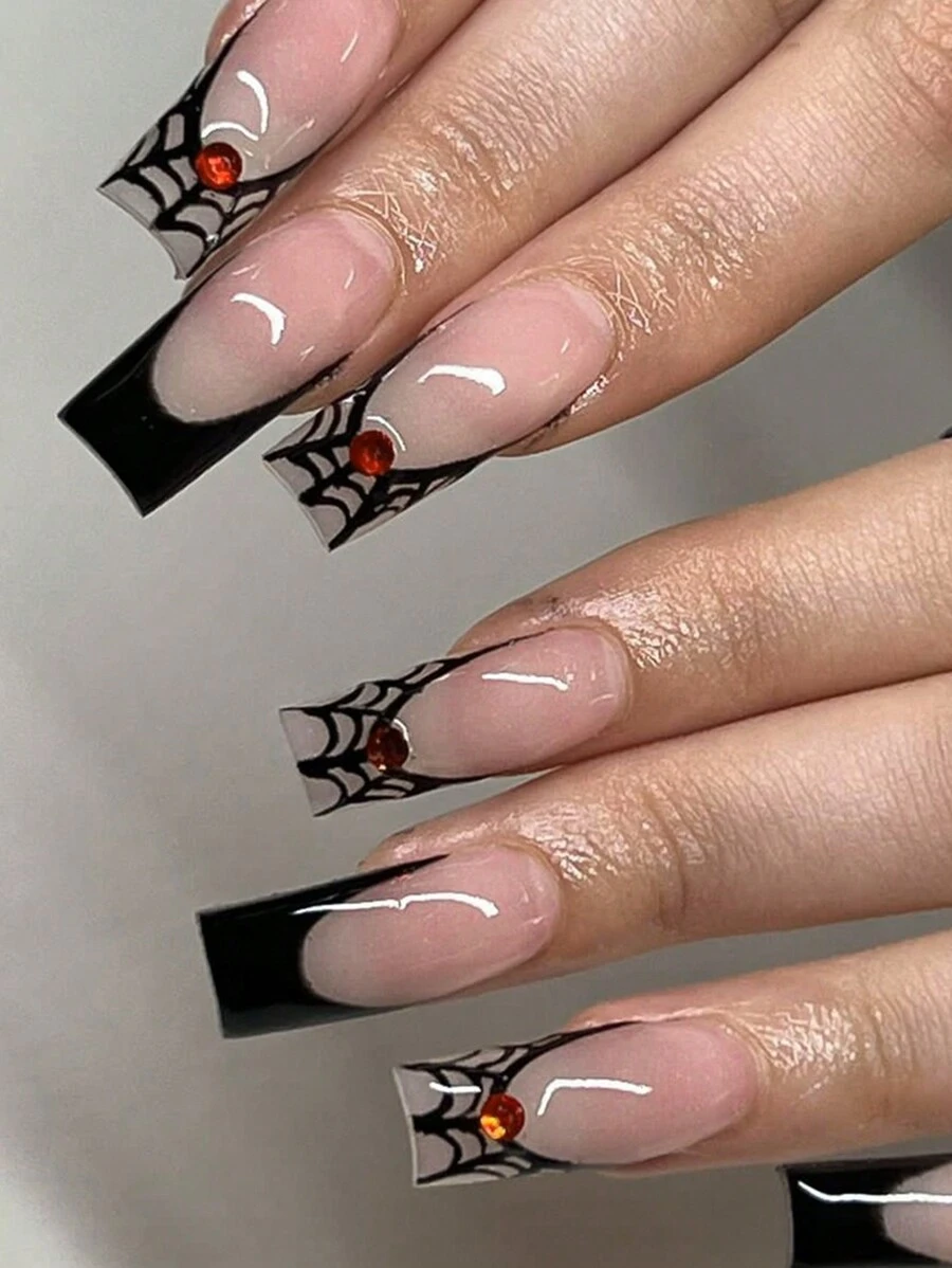 Goth 24pcs Long Coffin Spider Web Pattern Fake Nail & 1pc Nail File & 1sheet Tape