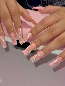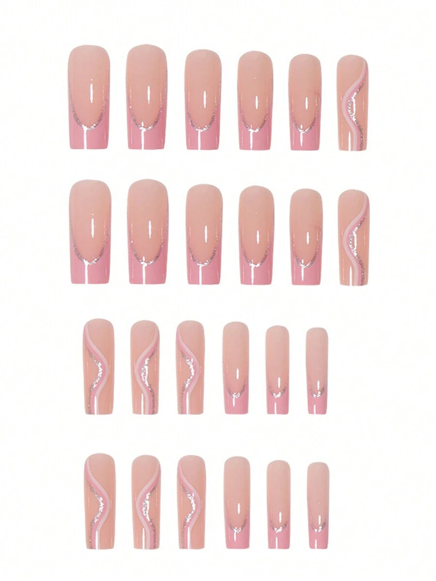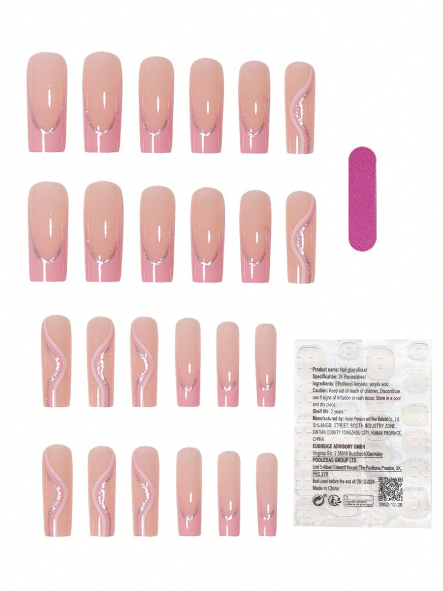 Kawaii 24pcs Long Coffin Striped Glitter Fake Nail & 1pc Nail File & 1sheet Tape