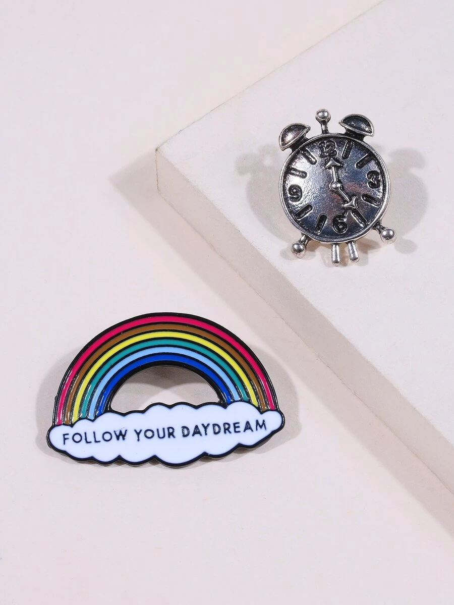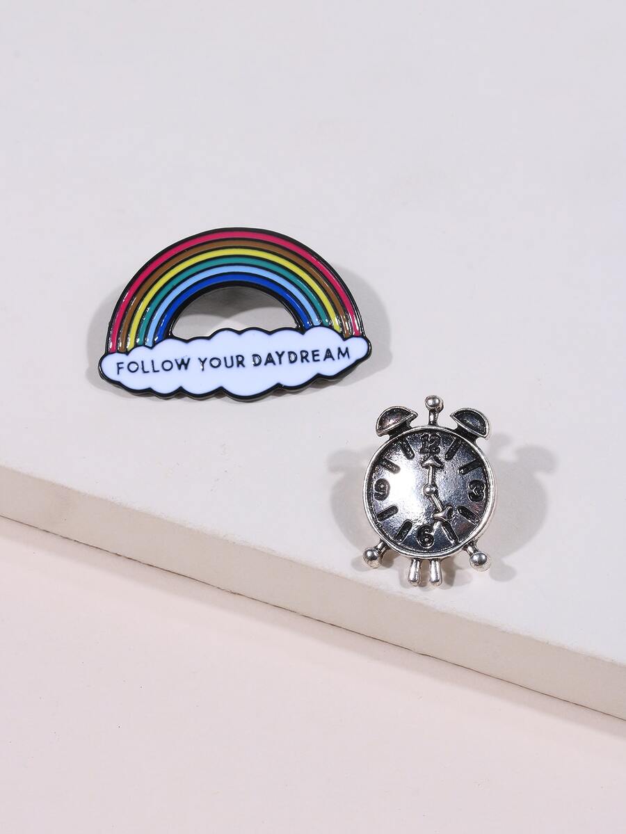 2pcs Rainbow & Clock Brooch Set