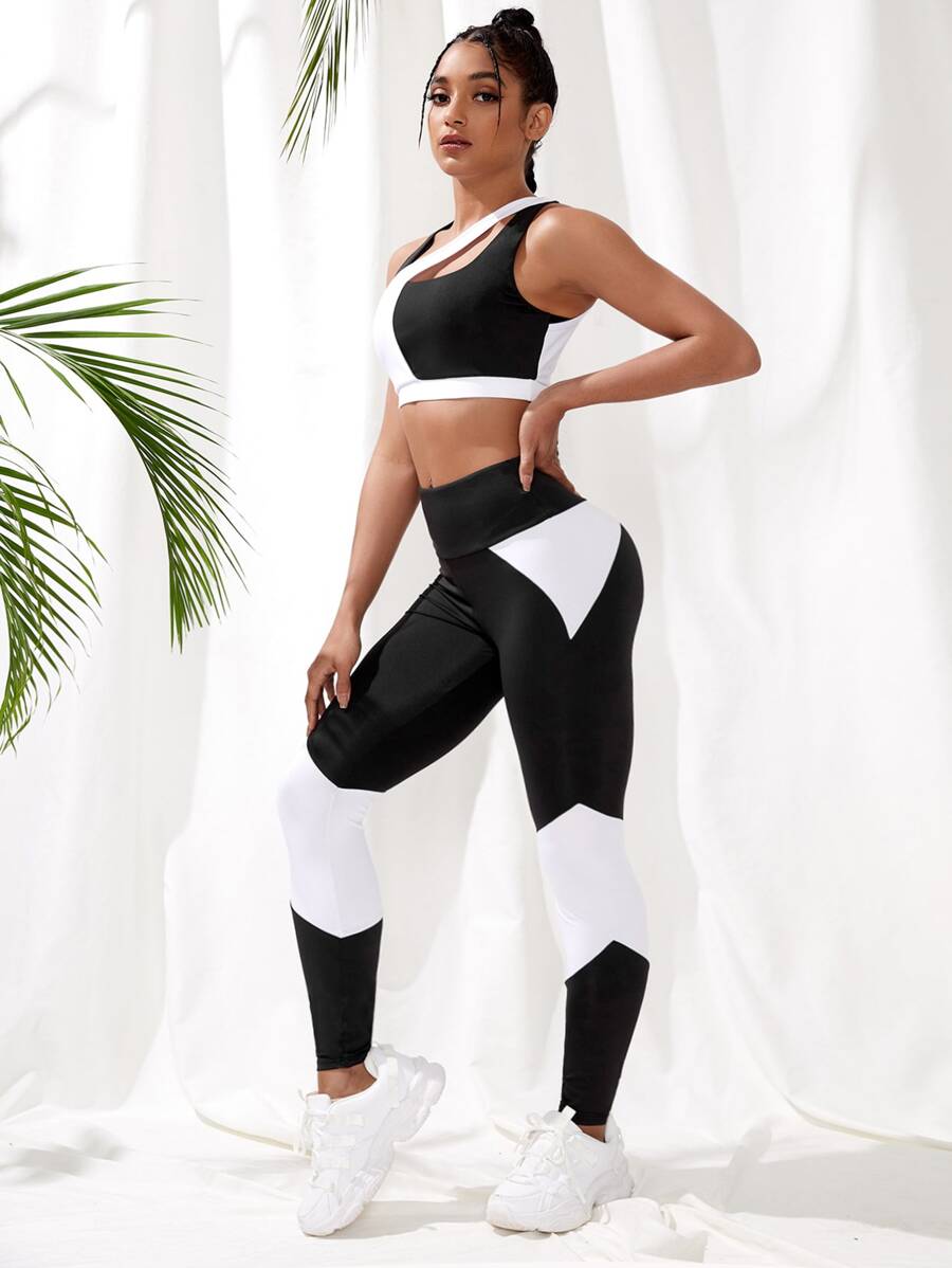 2pcs Two Tone Yoga Set Gym Wear Crisscross Bra & Booty Sculpt Wide Waistband Leggings