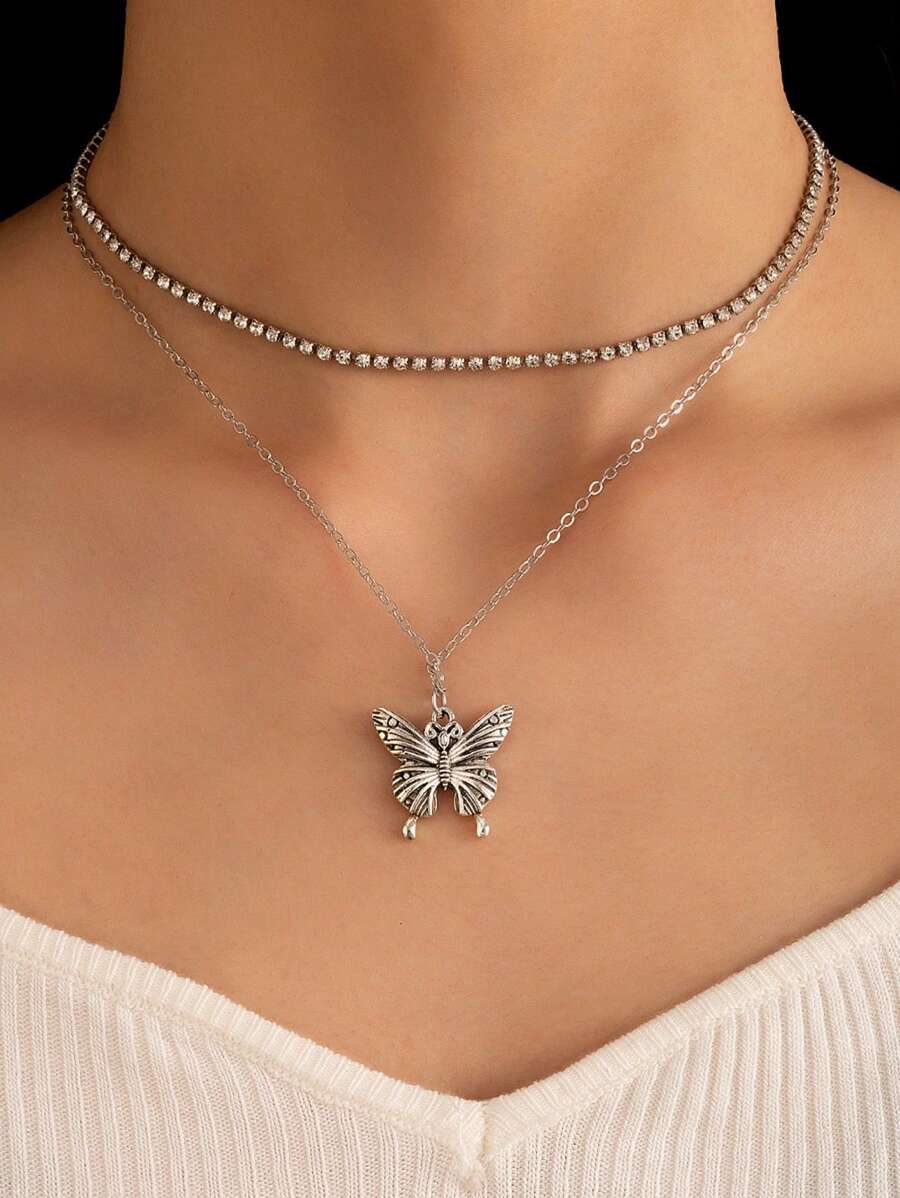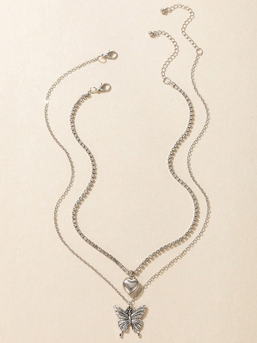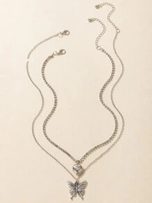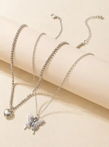 Fairycore 2pcs Women's Butterfly & Heart Shaped Pendant Necklace
