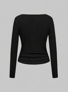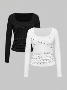 Grunge Punk 2pcs/Set Sexy Women's Rivet & Rhinestone Decor Round Neck Long Sleeve T-Shirt