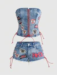 Y2K Avant-Garde Racing Motorcycle Biker Chic Women's Cropped Denim Bustier Top & Low-Waist Super Short Jeans 2 Pieces Set