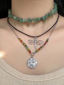 Fairycore 3pcs Fashionable And Fresh Style Round Pendant Crystal Beaded Necklace Set, Including Moon, Sun And Dragonfly Pendants