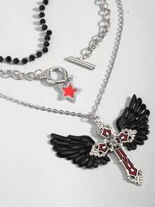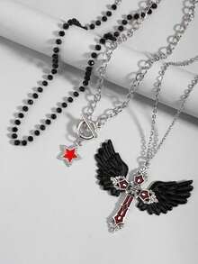 Goth 3pcs Punk Retro Skull, Pearl, Rhinestone Cross, Angel Wing Pendant Necklace, Layered Rhinestone Star Necklace, Minimalist Short Choker Necklace