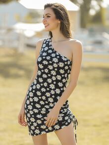 AAmilife Daisy Floral One Shoulder Drawstring Ruched Dress