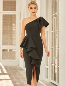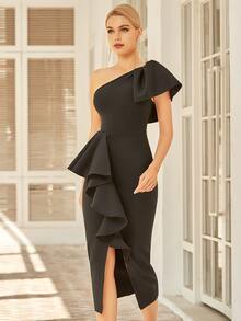One Shoulder Exaggerated Ruffle Bandage Prom Dress