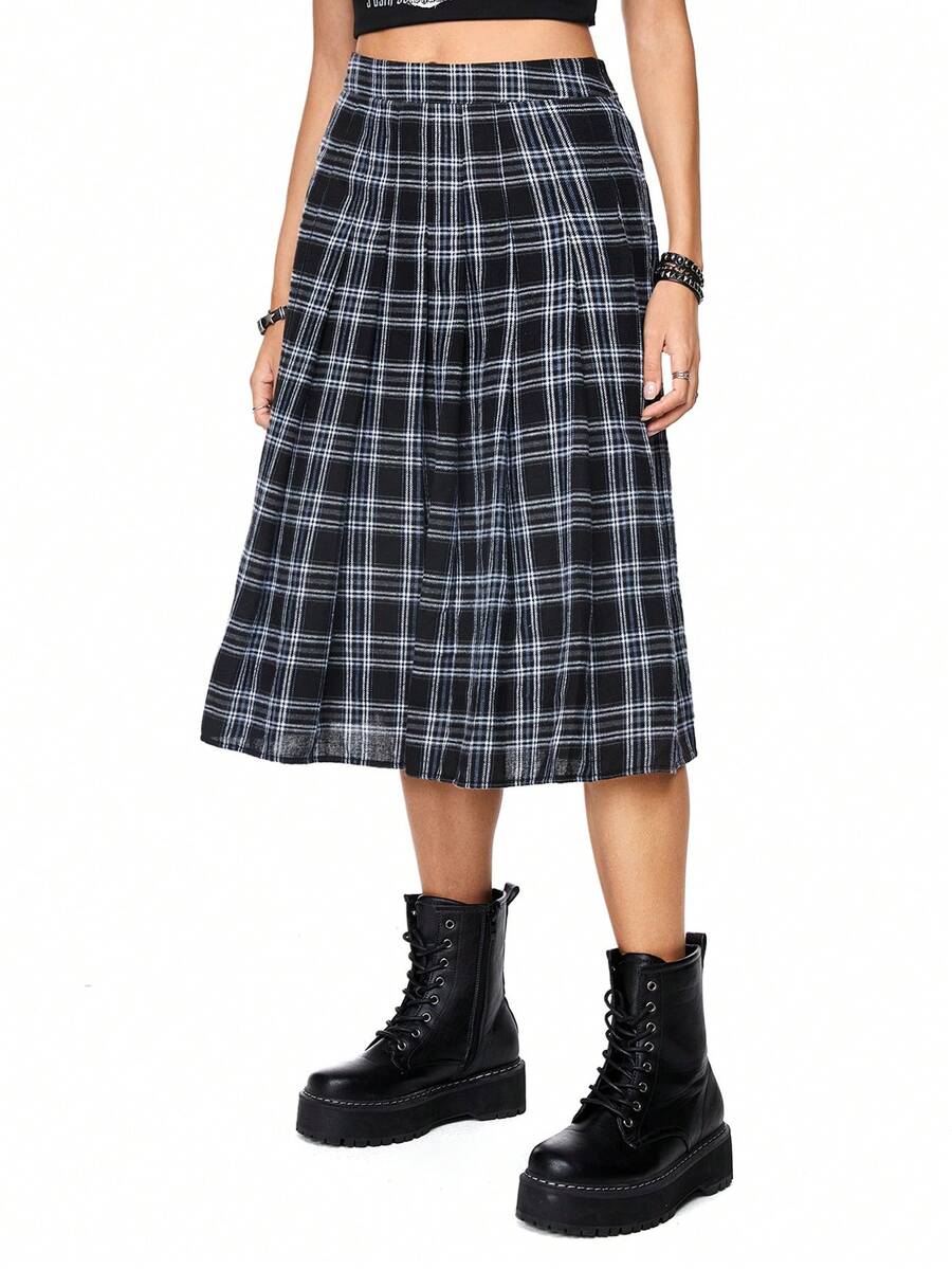 Academia College Style Women's Plaid Pleated Midi Skirt For Office, School