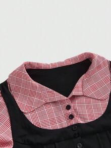 Academia Collegiate Style 2 In 1 Black & Gray Plaid Patchwork Short Sleeve Women Shirt
