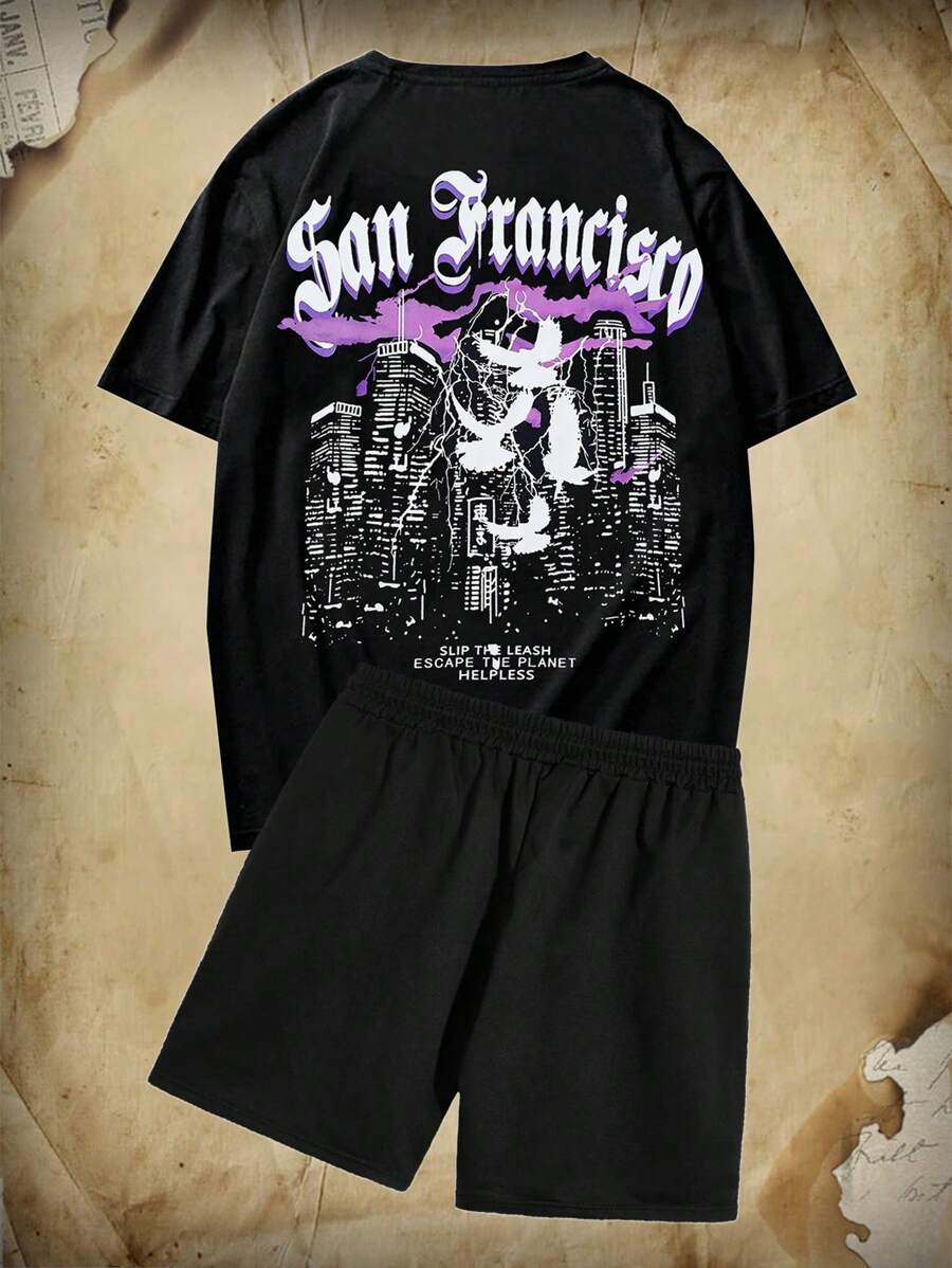 Academia Guys Letter Graphic Tee & Drawstring Waist Shorts