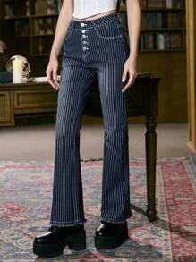Academia Striped Print Button Fly Flare Leg Jeans