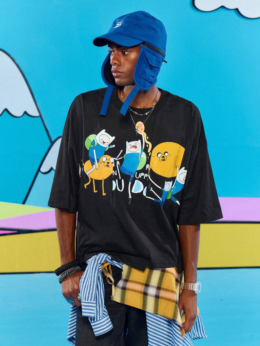 Adventure Time X ROMWE Men's Asymmetrical Print Patchwork Short Sleeve T-Shirt, Loose Cropped Fit