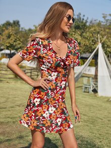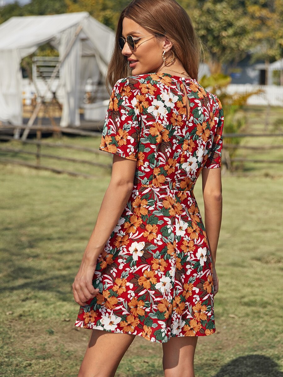 Allover Floral Knot Front Keyhole Back Dress