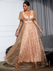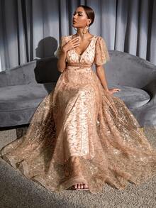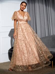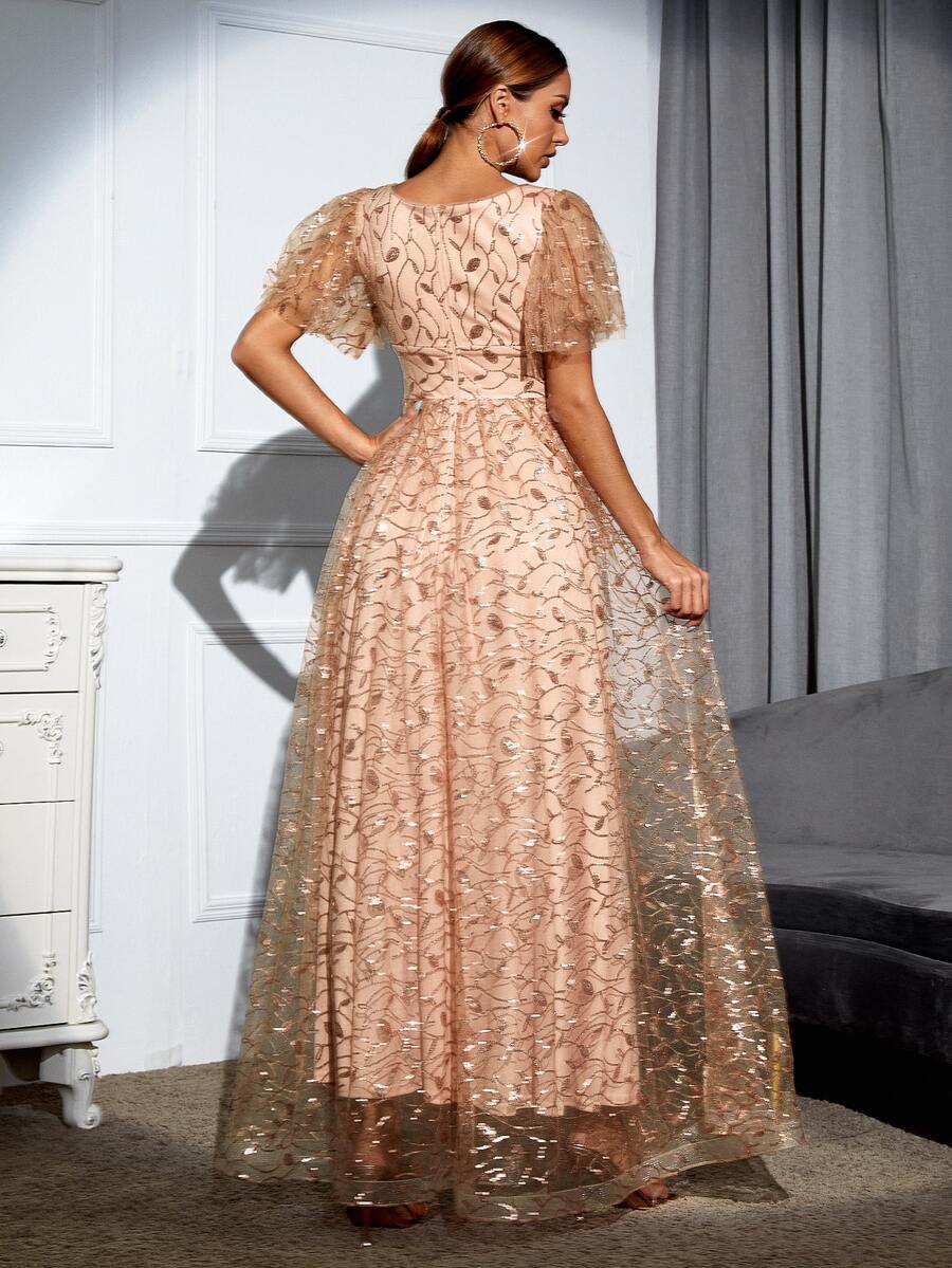 Allover Leaf Pattern Contrast Sequin Mesh Overlay Dress