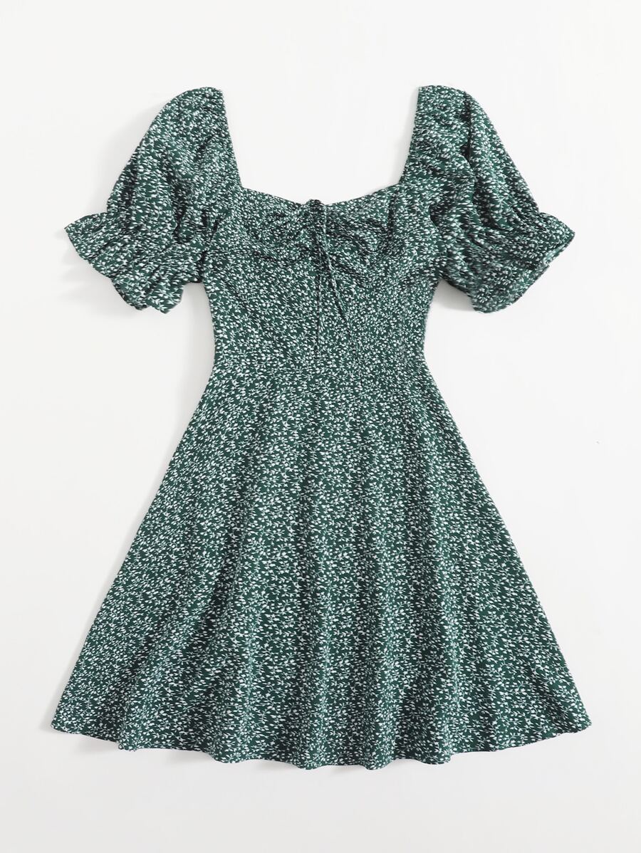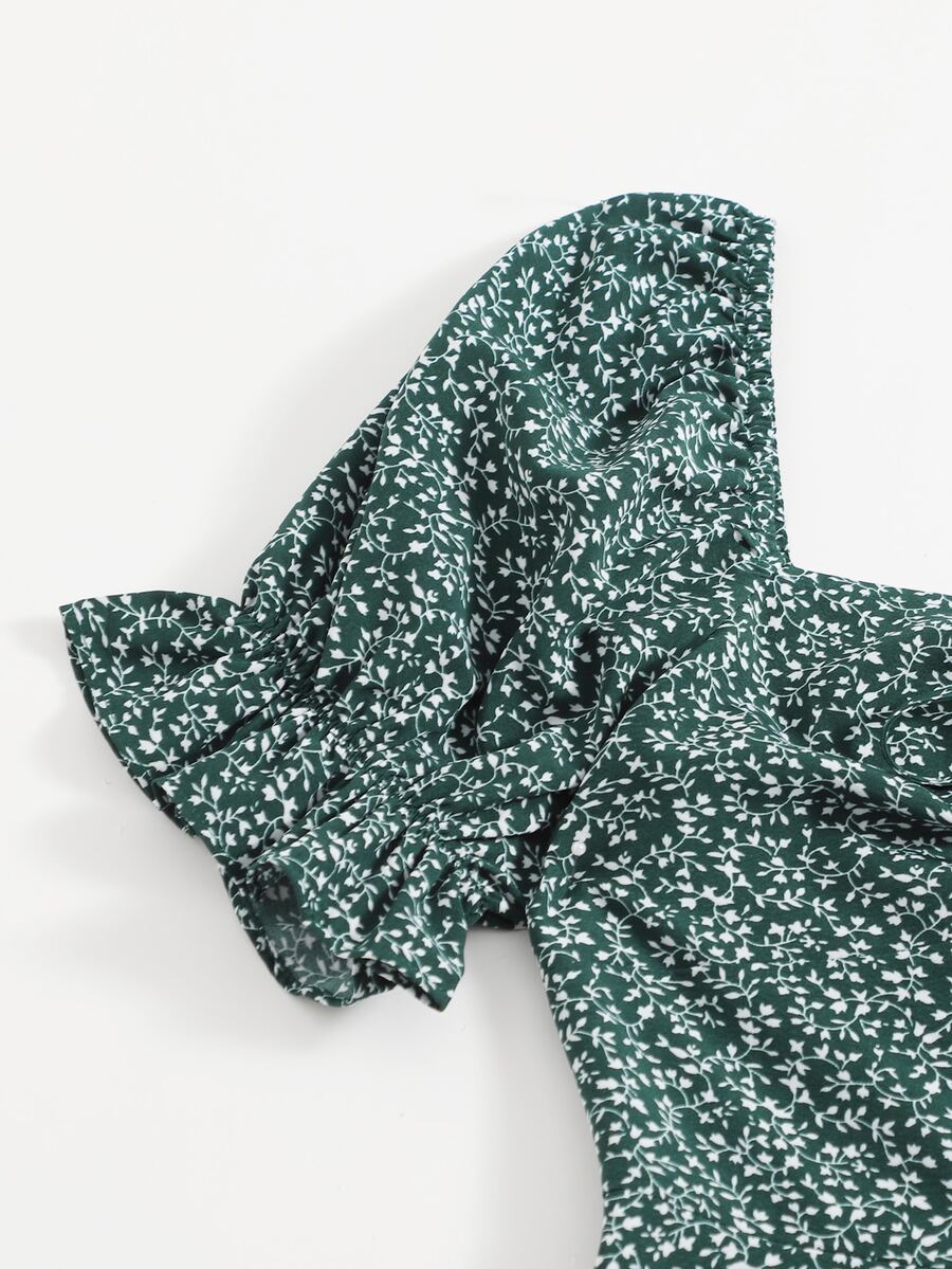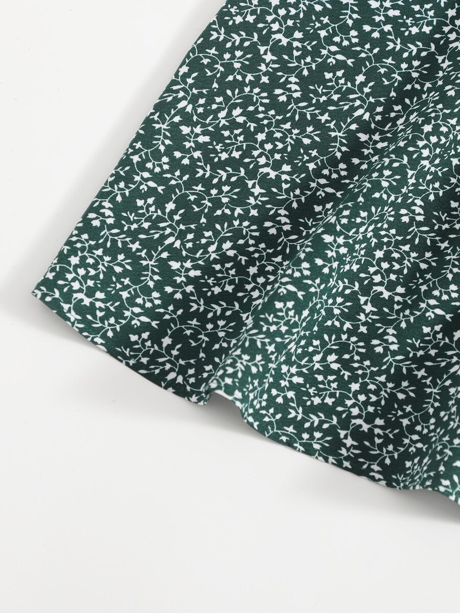 Allover Plants Print Drawstring Front Ruffle Cuff Dress