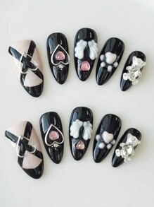 Anime 10pcs Cartoon Style Cat Claw & Little Bear Handmade False Nails With 3pcs Double-Sided Adhesive, Removable Y2K Heart Hand-Drawn Nail Stickers, High-Quality Rhinestone Colored Manicure, Suitable For Festival, Party, Dance And Daily Wear