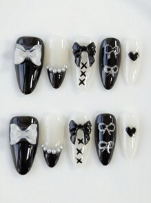 Anime 10pcs Cute & Cool Style Handmade False Nails With 3pcs Double-Sided Stickers, Removable Y2K Heart Hand-Painted Nail Stickers, High-Quality Curved Bow Line Nail Art, Suitable For Holidays, Parties, Dancing And Daily Wear