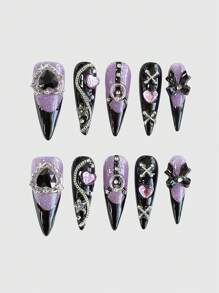 Anime 10pcs Long Dark Landmine Style Nail Art Stickers With 3pcs Double-Sided Adhesive, Y2K Handmade False Press On Nails For Party, Dance & Daily Wear, Reusable Nail Decals, Fake Nails