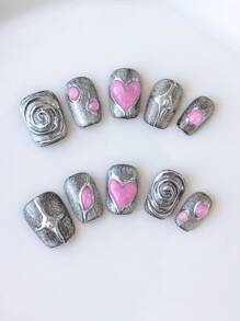 Anime 10pcs Y2K Style Pink Heart Pattern High Quality Handmade False Nails With 3pcs Double-Sided Tape, Removable Silver Cat Eye Glitter Nail Stickers, Suitable For Festival Parties, Dancing And Daily Wear